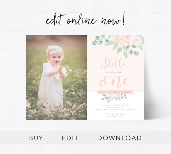 Editable Blush Floral Rose 1st Birthday Invitation Girl Baby Pink Gold First Birthday Printable Template Soft Boho Watercolor Flower Flo28 By Blue Bunny Printables Catch My Party