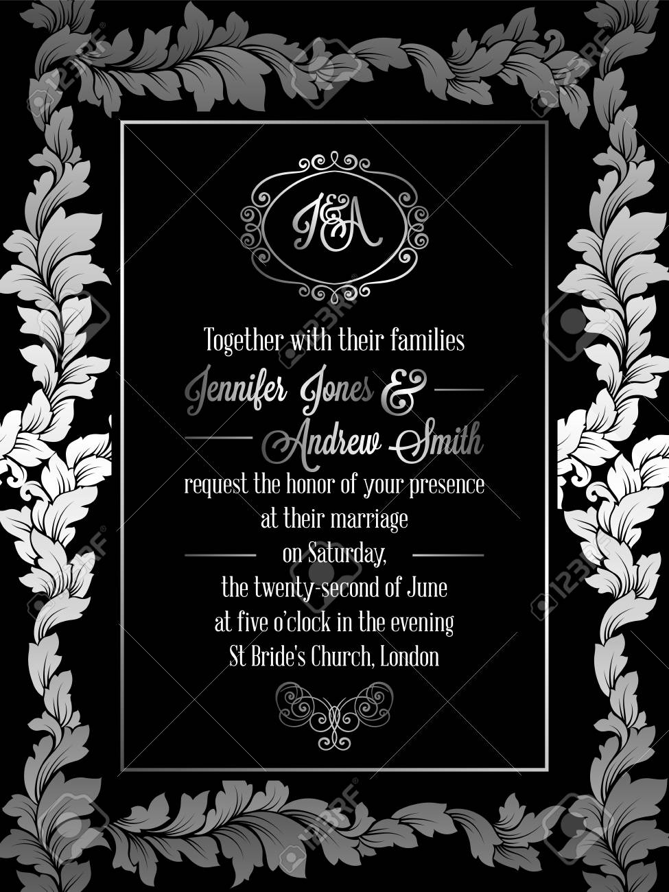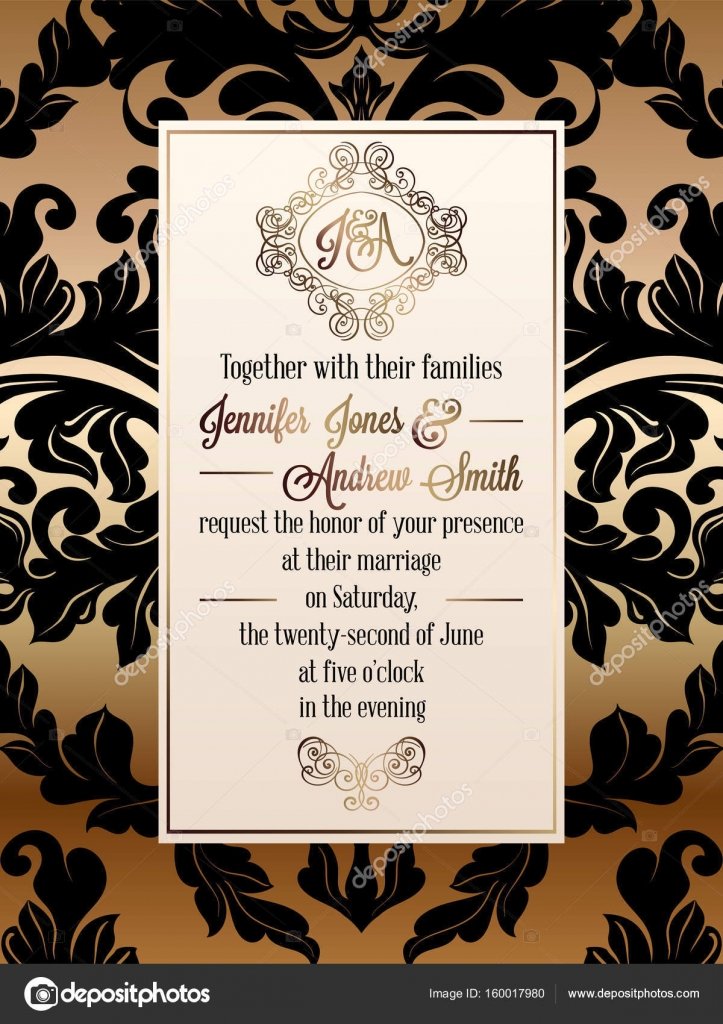 Vintage Baroque Style Wedding Invitation Card Template Elegant Formal Design With Damask Background Traditional Decoration For Wedding Gold And Black Background Stock Vector C Miamilky 159882624