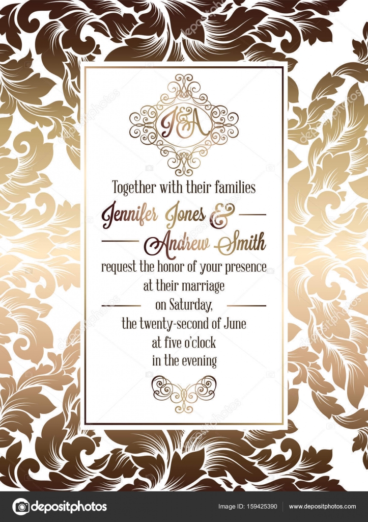 Vintage Baroque Style Wedding Invitation Card Template Elegant Formal Design With Damask Background Traditional Decoration For Wedding Gold On White Background Stock Vector C Miamilky 159425390