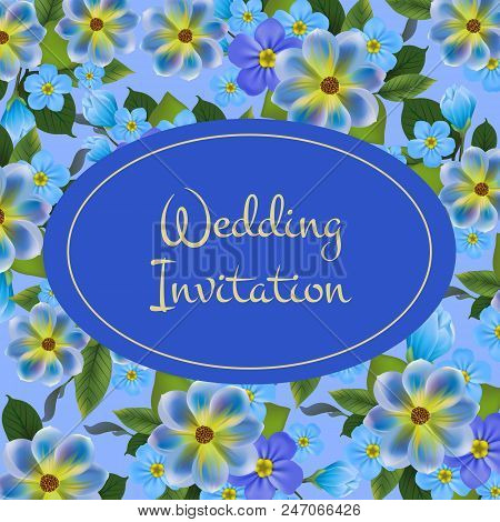 Wedding Invitation Card Design With Blue Flowers In Background Text On White Banner Can Be Used For Invitations Postcards Save The Date Templates Buy This Stock Vector And Explore Similar Vectors
