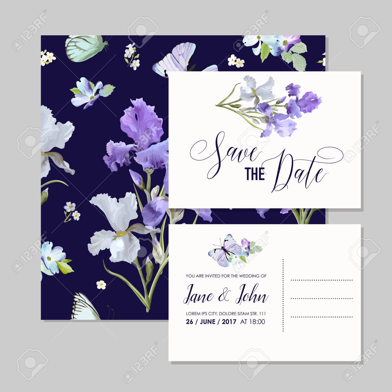 Save The Date Card With Iris Flowers And Flying Butterflies Floral Wedding Invitation Templates Set Design For Greeting Card Stock Vector Illustration Of Holiday Birthday 107667036