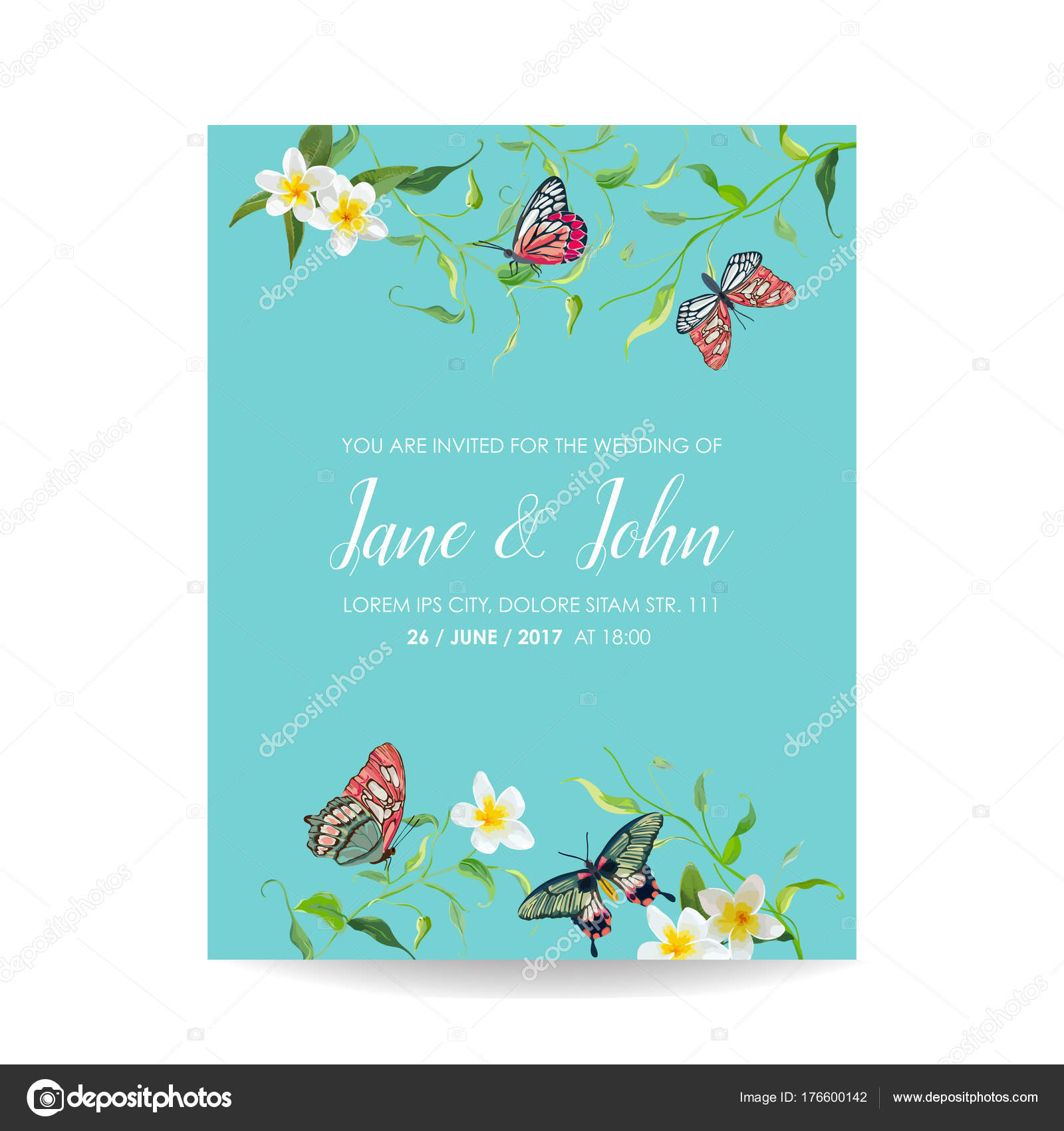 Wedding Invitation Template Tropical Design With Exotic Butterflies And Flowers Save The Date Floral Card Vector Illustration Stock Vector C Woodhouse 176600142