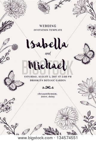 Save The Date Card With Flowers And Butterflies Floral Wedding Invitation Template Botanical Design For Greeting Cards Vector Illustration Buy This Stock Vector And Explore Similar Vectors At Adobe Stock
