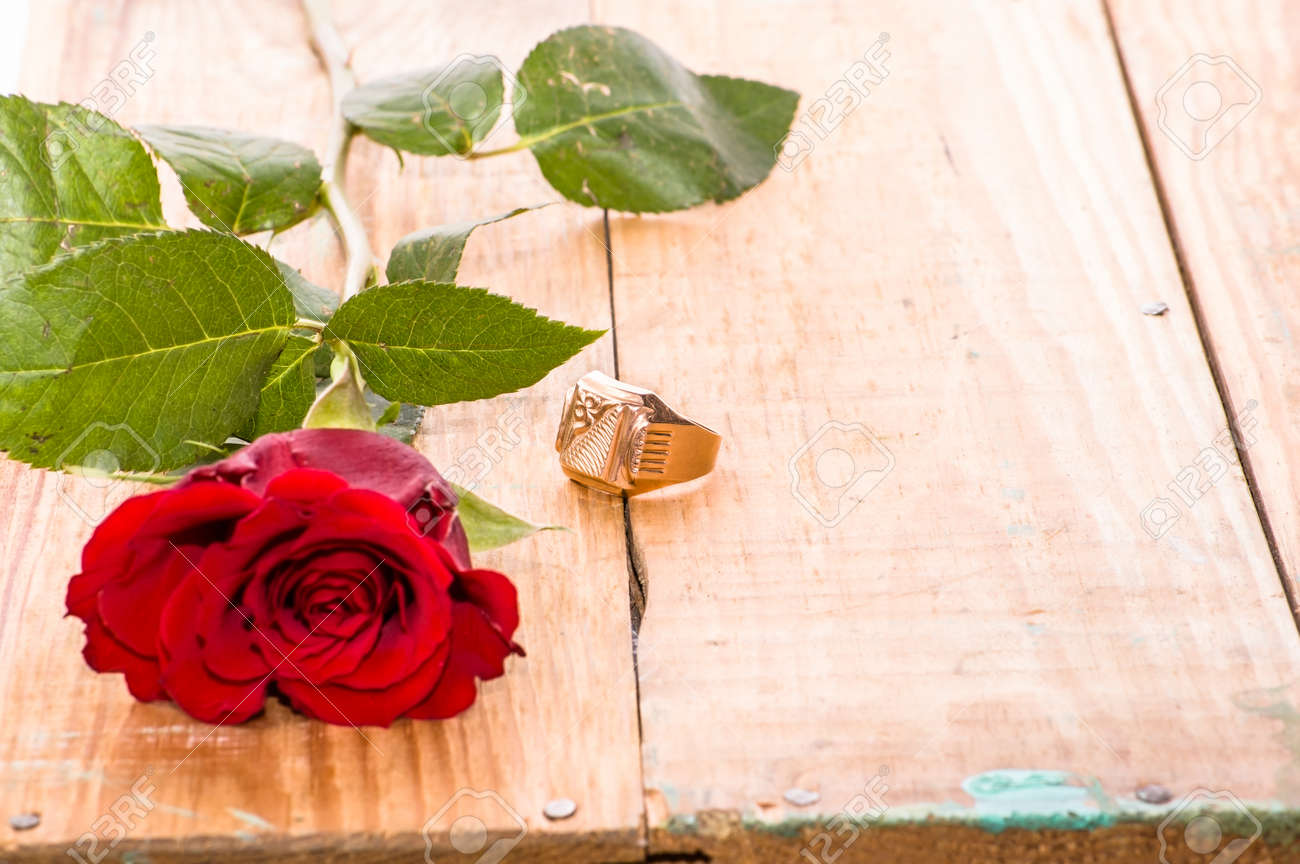 Red Roses And Engagement Ring On Wooden Background Wedding Invitation Stock Photo Picture And Royalty Free Image Image 90537817
