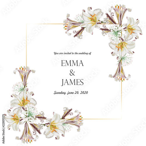 Botanical Wedding Invitation Card Template Design White Lily Flowers With Golden Frame On White Background Vintage Style Buy This Stock Illustration And Explore Similar Illustrations At Adobe Stock Adobe Stock