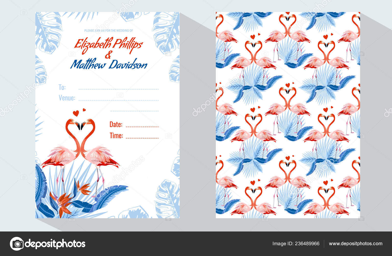 Wedding Event Invitation Card Template Exotic Pink Flamingo Birds Body As Rose Flower Concept Tropical Jungle Forest Green Palm Tree Leaves Luxury Shiny Golden Text Placeholder Horizontal Layout Vector Stock Images