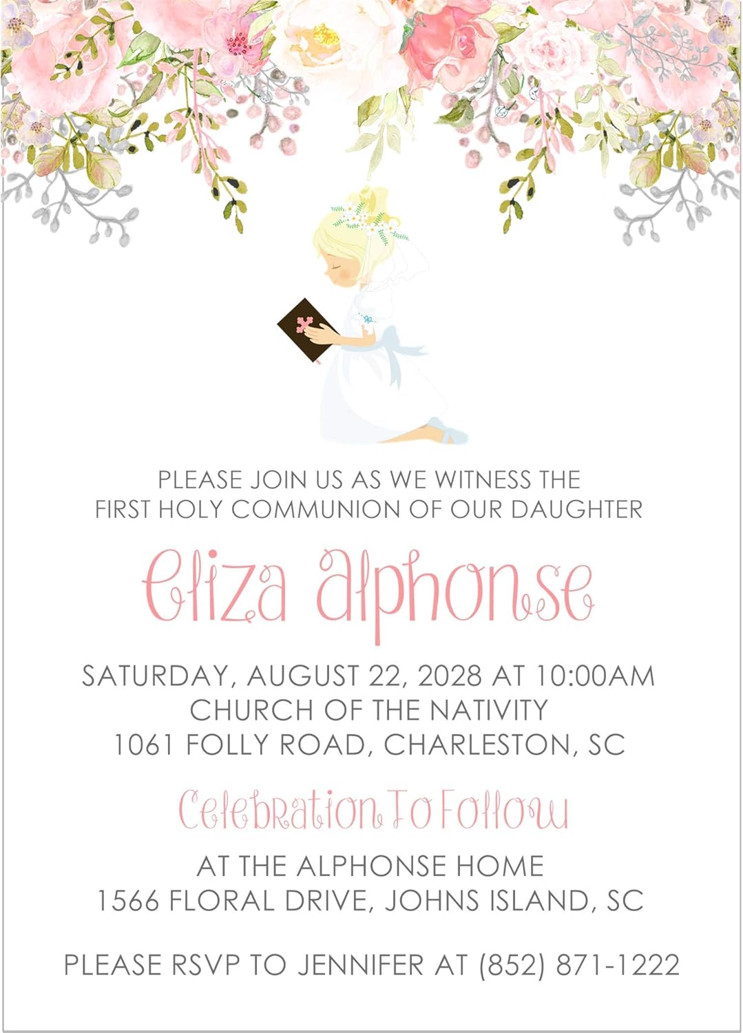 Editable Blush Floral First Holy Communion Invitation Template Bobotemp