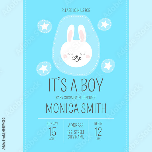 Cute Baby Shower Boy Invite Card Vector Template Cartoon Animal It S A Boy Illustration Blue Design With Little Bunny And Stars Patches Kids Newborn Poster Or Birthday Party Invitation Background Buy