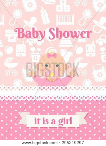 Baby Shower Invitation Card Vector Baby Girl Banner Welcome Template Invite Pink Design Cute Birth Party Background Happy Greeting Poster With Newborn Kid And Stork Cartoon Flat Illustration Buy This Stock