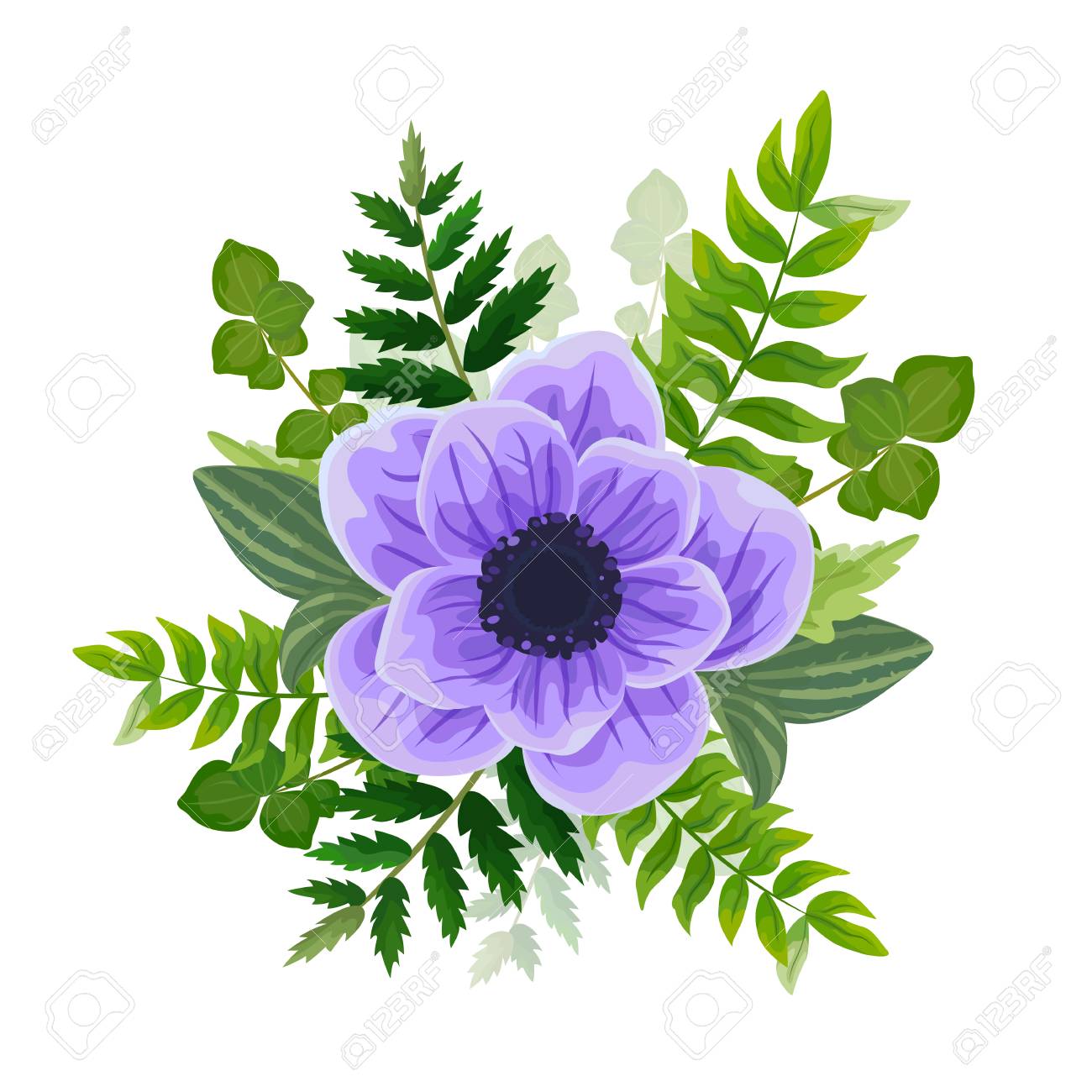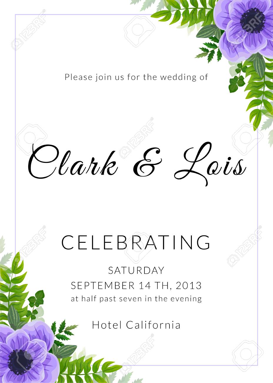 Wedding Invitation Card Lovely Template Card Design With Violet Anemone Flower Forest Greenery Ferns Plants Green Leaves Stock Illustration Illustration Of Beautiful Friendly 117713638
