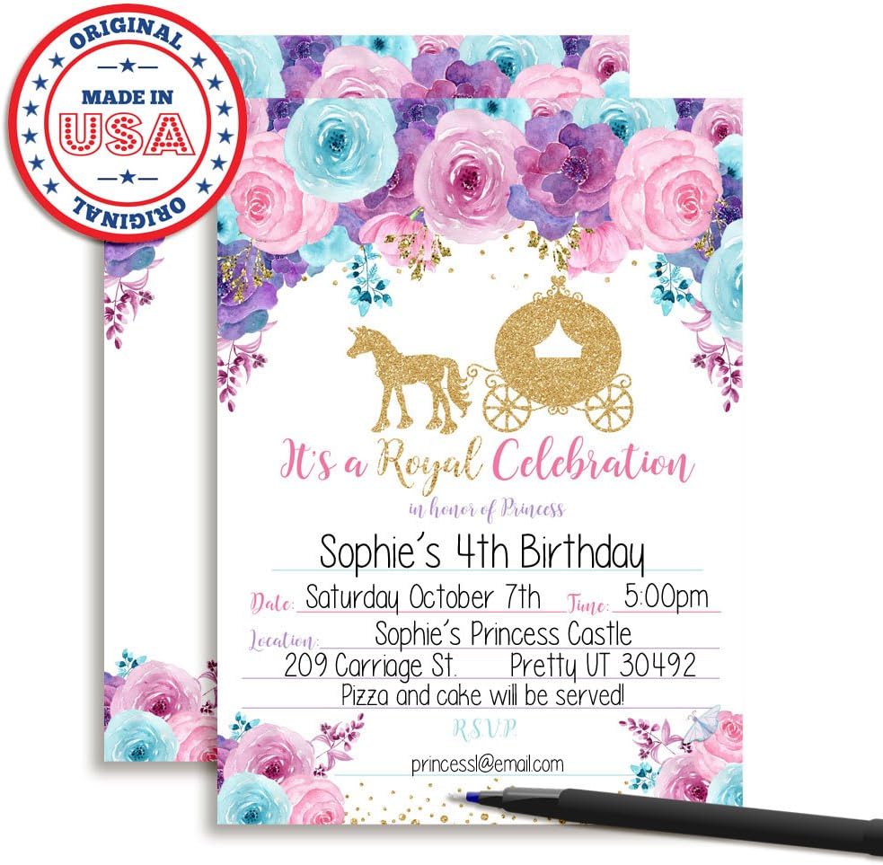 Amazon Com Watercolor Floral Gold Glitter Princess Carriage Birthday Party Invitations For Girls 20 5 X7 Fill In Cards With Twenty White Envelopes By Amandacreation Office Products