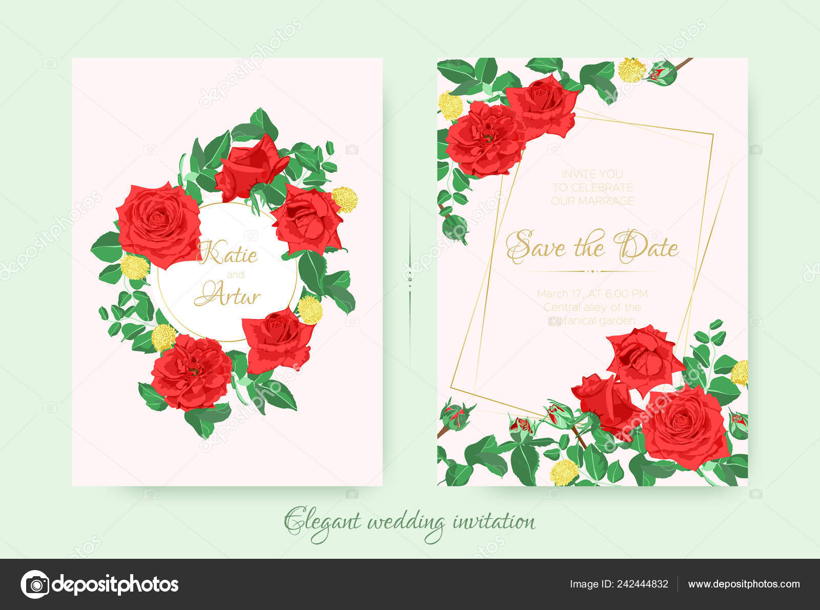 Wedding Cards With Red Roses And Green Leaves Elegant Invitation Royalty Free Cliparts Vectors And Stock Illustration Image 120819664