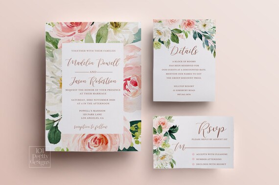 Blush Rose Gold Wedding Invitation Template Set Blush Flowers Etsy