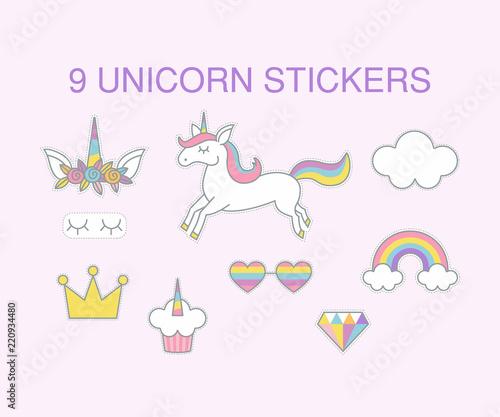 9 Unicorn Stickers Vector Design For Greeting Birthday Invitation Card Unicorn Rainbow Sweets And Other Objects With Light Pink Background Buy This Stock Vector And Explore Similar Vectors At Adobe Stock