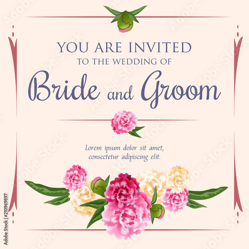 Wedding Invitation Design With Bunch Of Peonies On Pink Background Text In Frame Can Be Used For Invitation Cards Postcards Save The Date Templates Buy This Stock Vector And Explore Similar