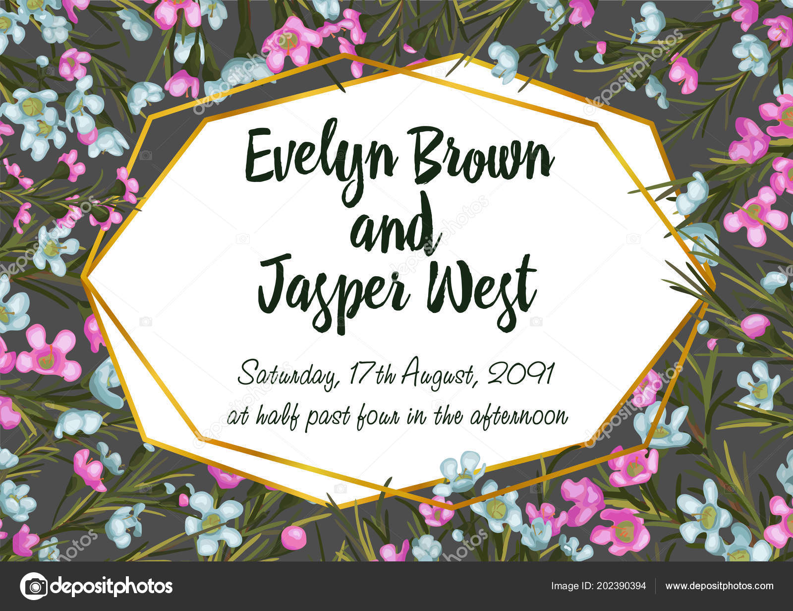Cartoon Couple Rustic Blossom Flowers Date Wedding Invitation Card Brick Stock Vector C Eespace 188614040