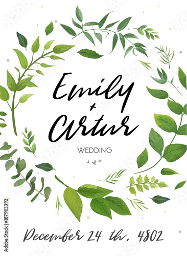 Wedding Invitation Floral Invite Card Design Green Fern Leaves Elegant Greenery Foliage Eucalyptus Forest Bouquet Decorative Frame Wreath Print Vector Elegant Trendy Rustic Save The Date Postcard Buy This Stock Vector