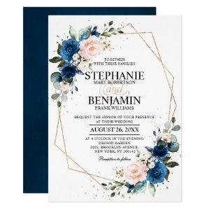 Navy Blue Blush Pink Flowers Wedding Invitation Design 730