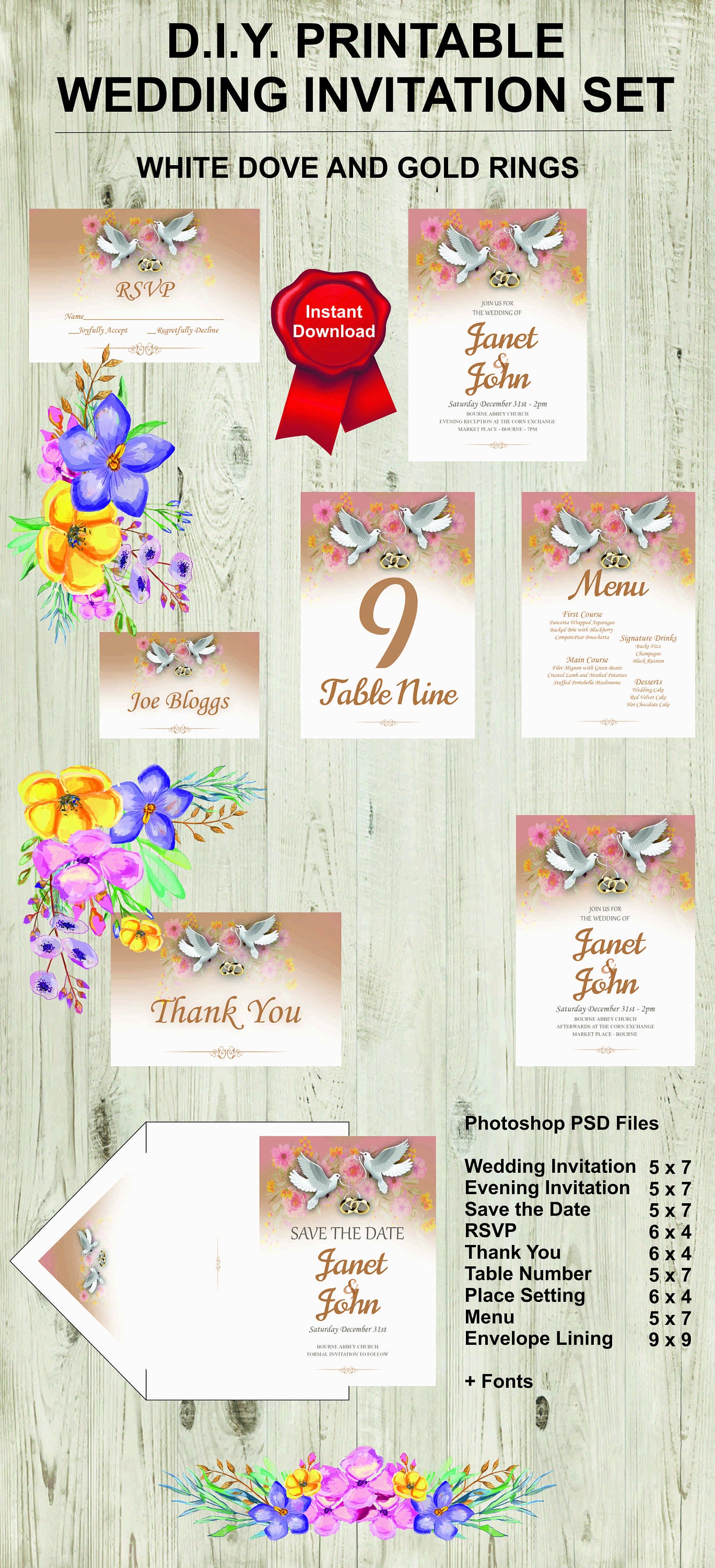 White Dove Gold Rings Wedding Invitation Pack Collection Instant Download Self Printable Wedding Invitations Editable Photoshop Psd Files
